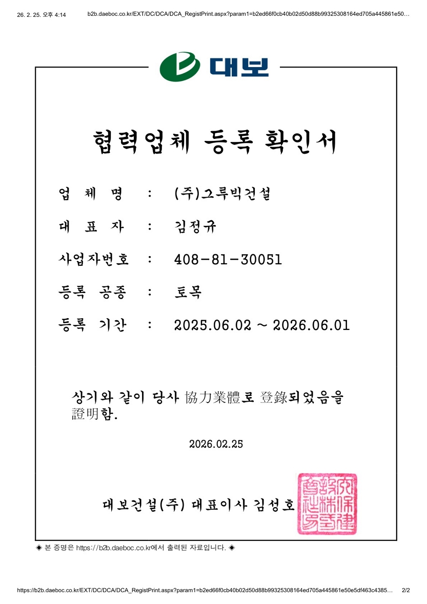 본문 사업분야 협력업체 업체명 대보건설(주) 기타 대보건설(주) 목록 이전글삼부토건 주식회사 26.04.06 다음글용인국제물류 도로공사 중 『토공 및 구조물공사(1구간)』 25.10.24